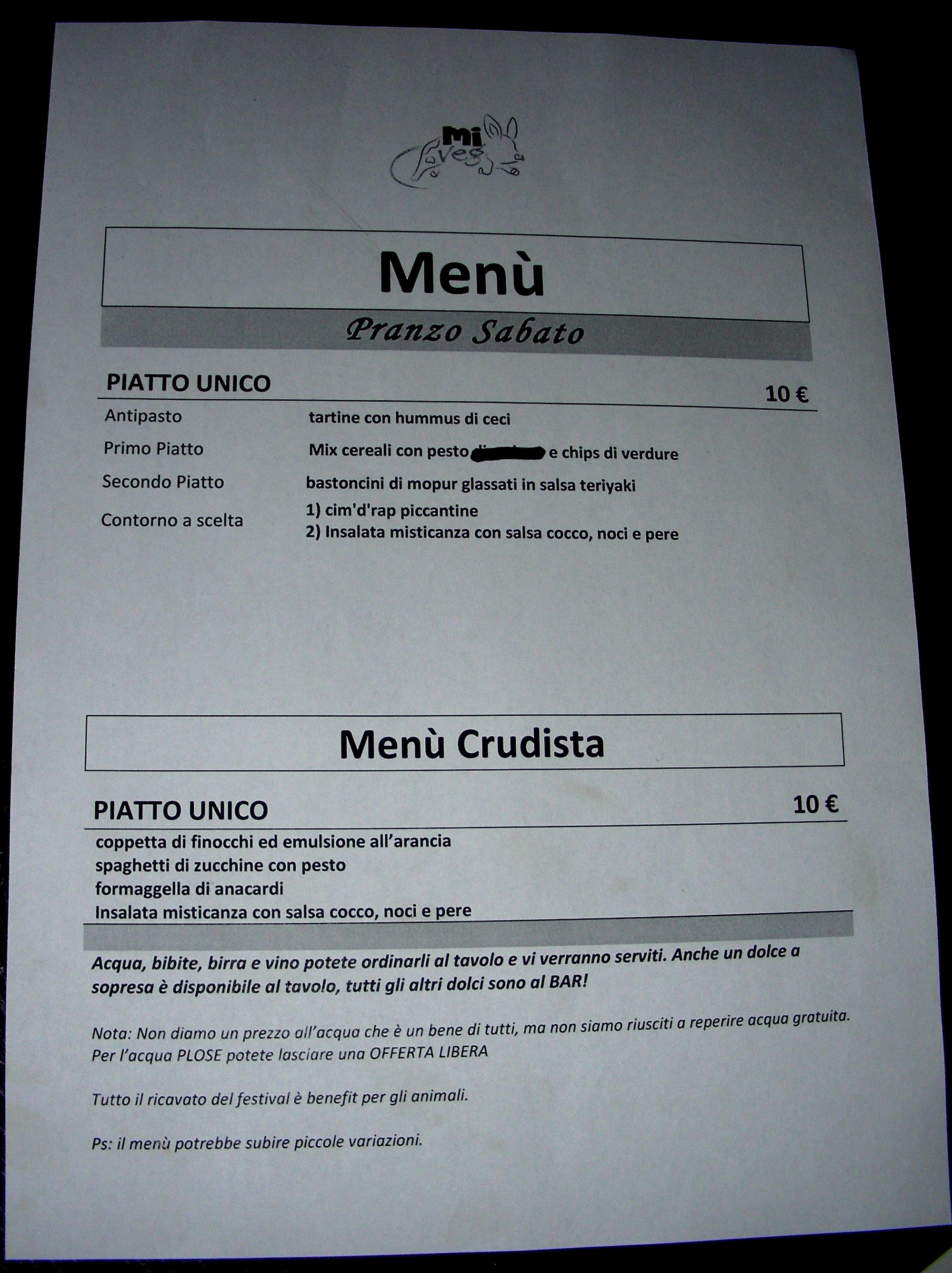 - Uno dei menu. Il menu era sempre diverso nei due giorni ma anche fra pranzo e cena